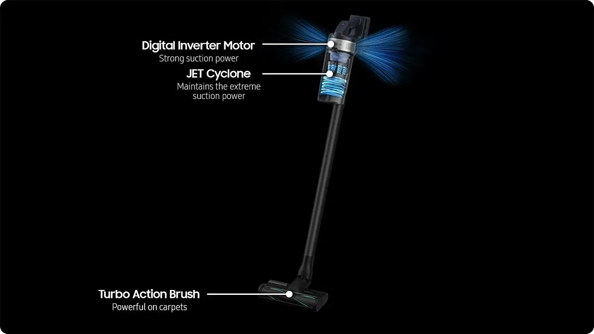 Pick up everything from spilt cereal to stubborn pet hair in seconds, thanks to a powerful Digital Inverter Motor which comes with a 10-year parts(1) warranty. Thanks to this optimal structure, the Digital Inverter Motor delivers a strong input power of up to 550W(2), maintains a high level of energy efficiency and generates a suction power up to 200W(2).